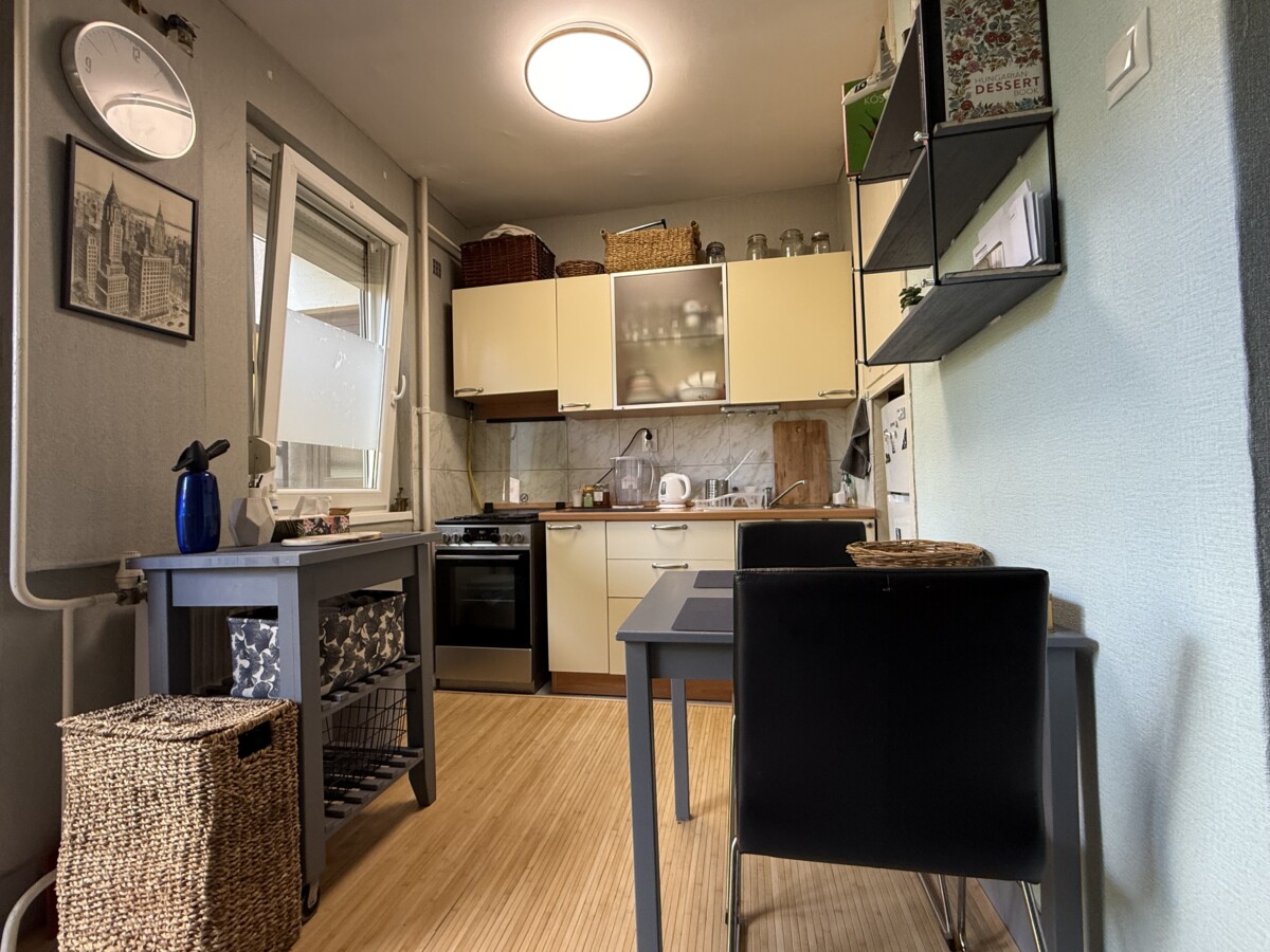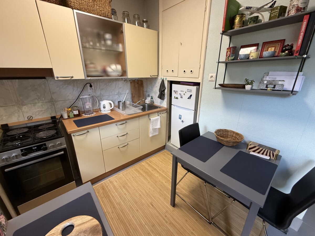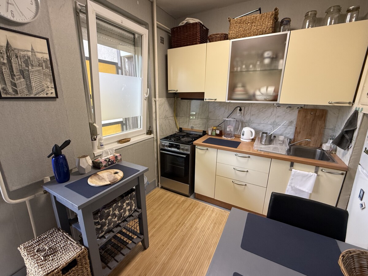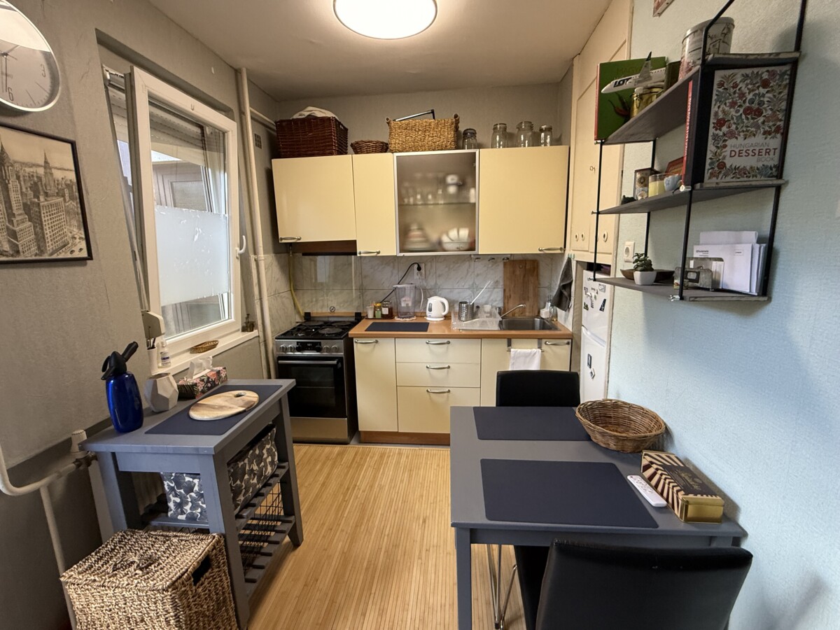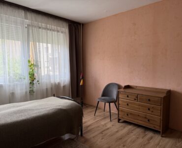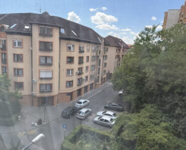 A bright and spacious 55 m² apartment is available for rent just 100 meters from Corvin Quarter, located on the 4th floor of a building on Leonardo da Vinci Street in District IX.