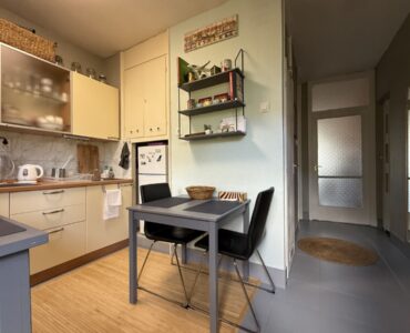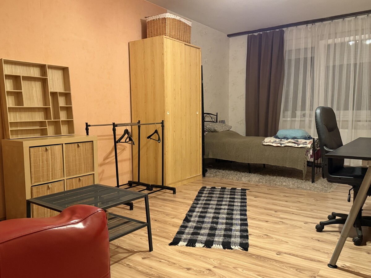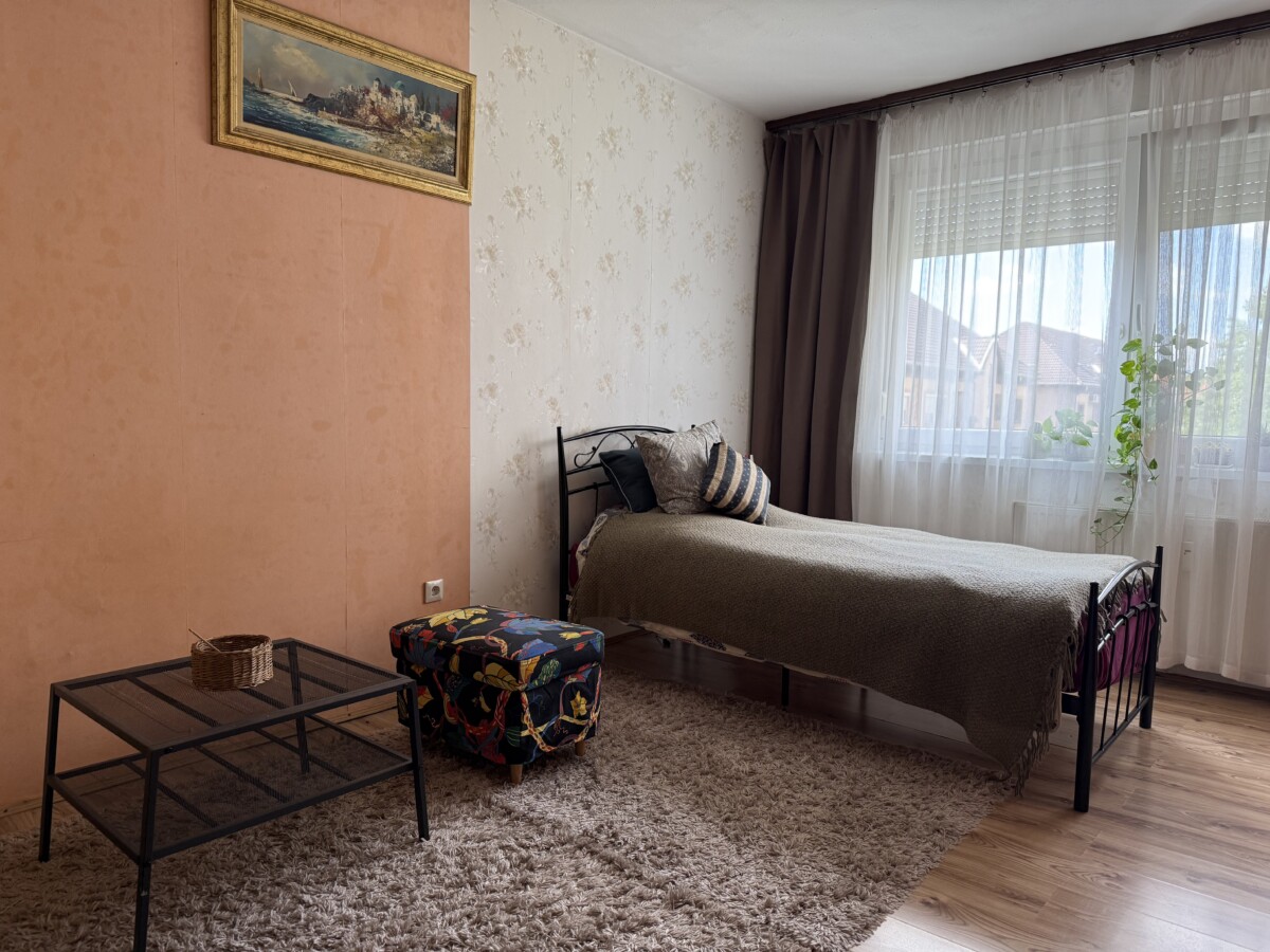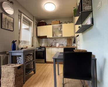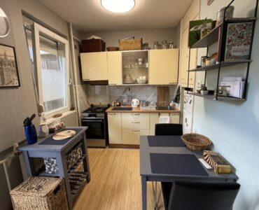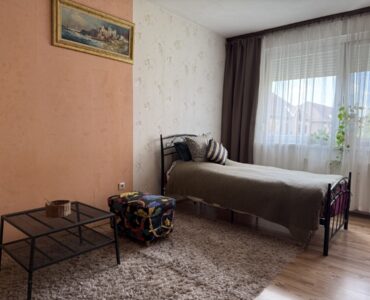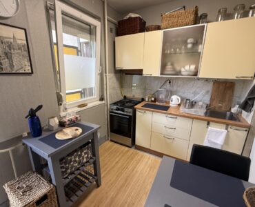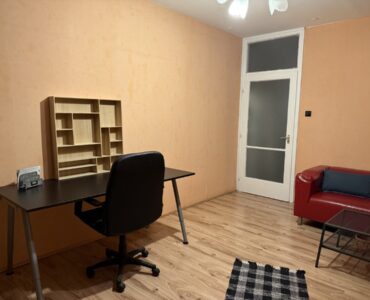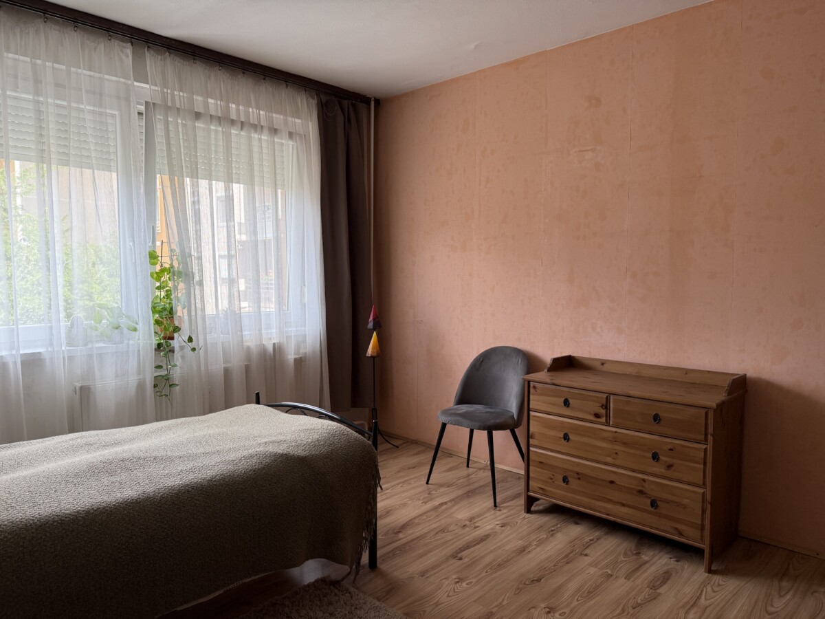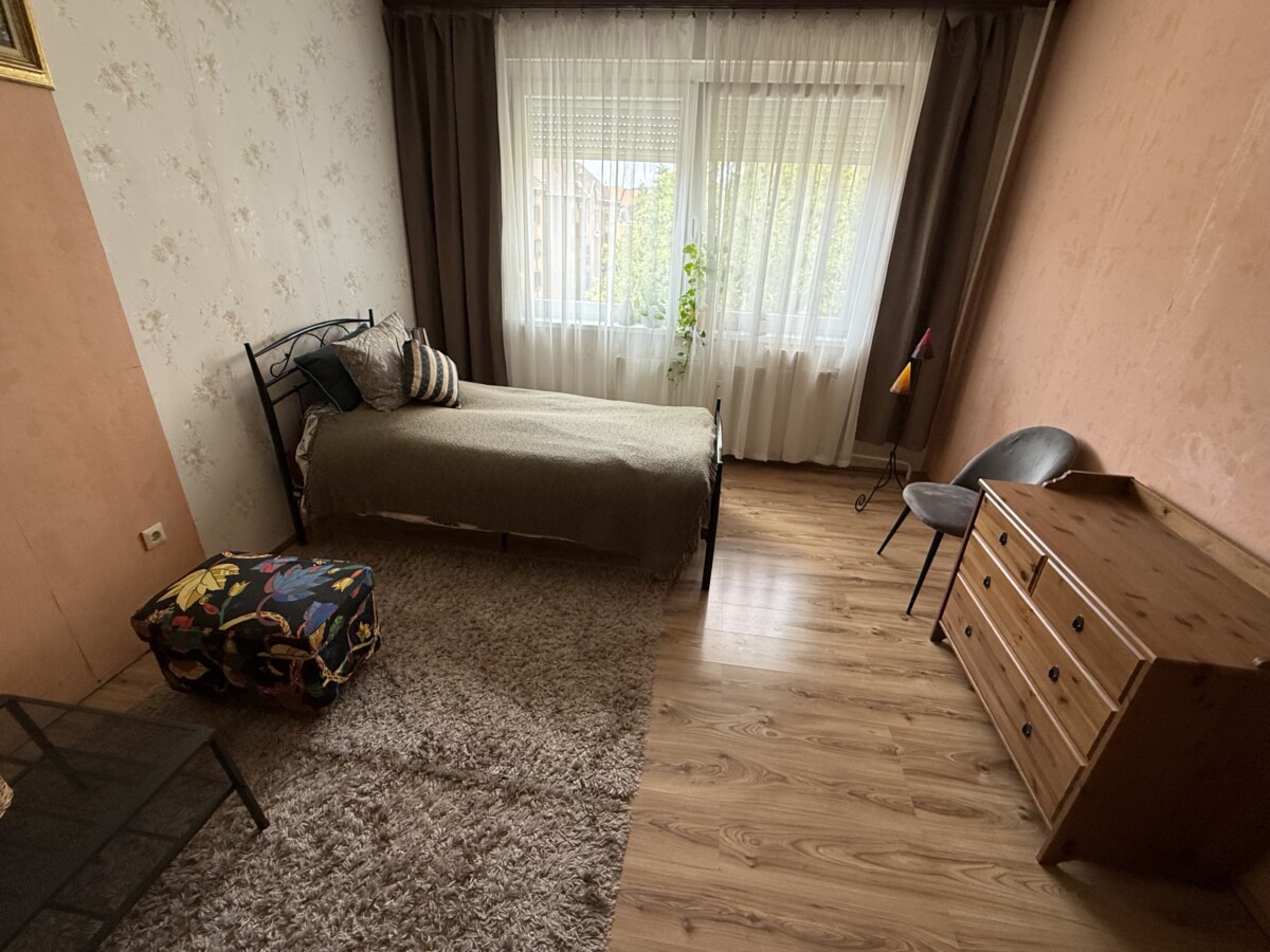 A bright and spacious 55 m² apartment is available for rent just 100 meters from Corvin Quarter, located on the 4th floor of a building on Leonardo da Vinci Street in District IX.